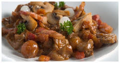 Hertenvlees heeft een milde wildsmaak en bevat bijzonder weinig verzadigde vetten ,en levert net als andere soorten rood vlees veel ijzer en mineralen.Serveer met aardappelpuree, in de schil gebakken aardappelen of pasta.